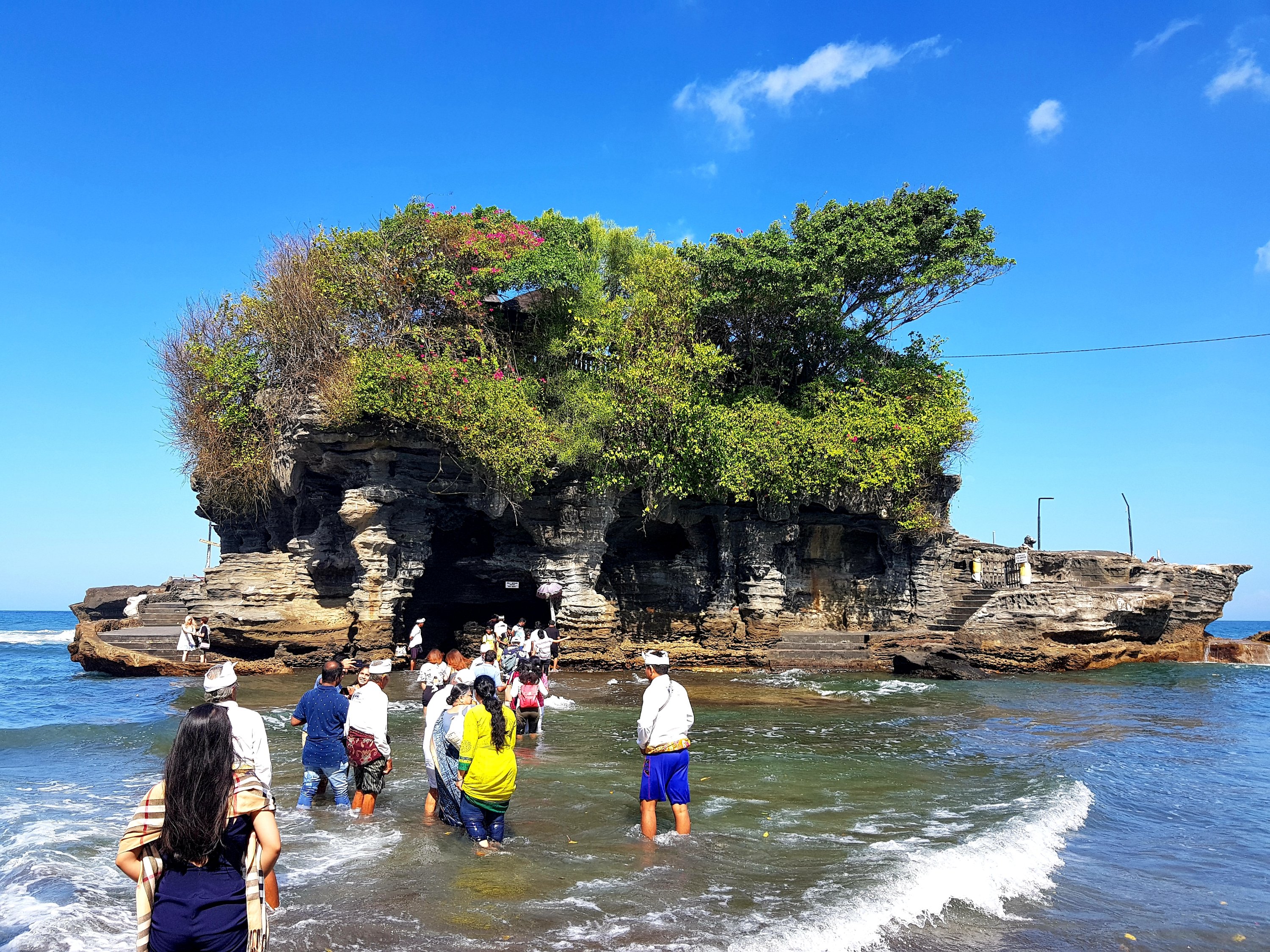 Possibly the best attraction near Canggu is Tanah Lot – one of the seven sea temples around the Balinese coast. The best way to get there and back is by taxi. Entry to the site is 60,000Rp. After paying you’ll find yourself on a market street with batik clothing stands, souvenir shops and a few restaurants. Beyond the market street, you’ll come to the rocky shore from which you can see the beautiful Tanah Lot standing out to sea. The idea is to walk through a stretch of sea to get to the temple and receive a blessing – currently, the temple is a site of Hindu pilgrimage. The route across the water is marked out by friendly sea people who are there to help you cross if needed. The temple is a sea temple for worship of Balinese sea gods. It is the work of Dang Hyang Nirartha who rested on a beautiful rock out to sea. After fisherman saw him and brought him gifts, he instructed them to build a shrine on the rock for the sea gods. The tide was low when we walked across the sea and out to the temple and at the base we saw a black and blue snake swimming in the water – despite being a little freaked out, it was cool to see one of the venomous sea snakes said to guard the temple from evil spirits and intruders. You can’t enter the temple of even climb up the stairs but on the lower ground you can drink water from a spring and get blessed with some rice on your forehead and a base of rock, venomous sea snakes ti guard against evil sprits ans intruders. Cant go up into the temple, half of it has been redone. But you can get blessed with rice on your forehead and a frangipani flower in your ear. The tide moves fast and even though we weren’t on the rock very long, by the time we made our way back across the sea, the waves were much higher and the sea helpers were greatly appreciated.